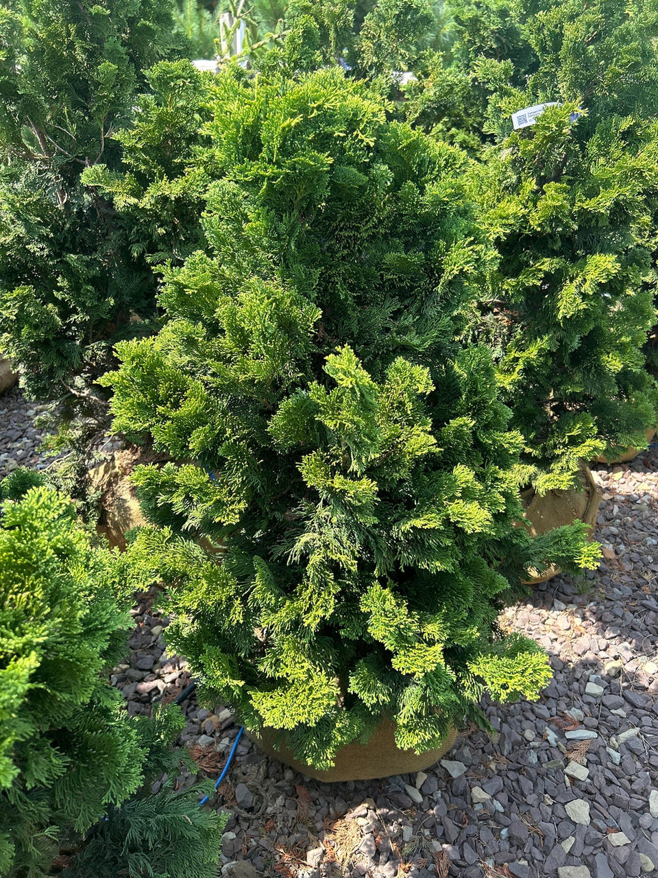 Introducing the Compact Hinoki Cypress, also known as Chamaecyparis obtusa Compacta. This stunning evergreen shrub features a compact growth habit, making it perfect for small gardens or as a striking focal point in any landscape. The elegant, fan-shaped foliage is a vibrant green color, providing year-round interest and adding a touch of tranquility to any outdoor space. The Hinoki Cypress is a low-maintenance plant that thrives in well-drained soil and partial shade, and requires minimal pruning to maintain its tidy, compact form. Add a touch of Japanese-inspired beauty to your garden with this beautiful and versatile evergreen shrub.