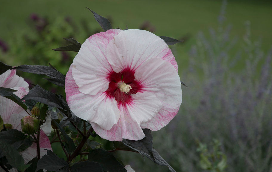 "A naturally compact selection that works well in large containers. Large 7-8”, white flowers with a red eye are produced all over the dense, rounded clump of deep black-purple maple-like leaves.